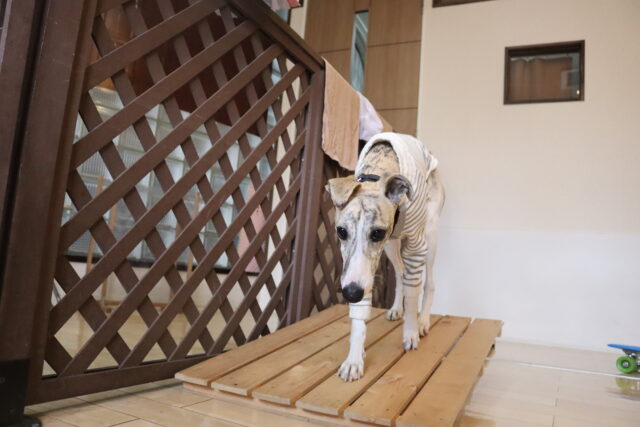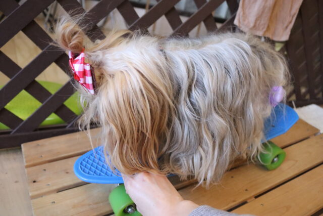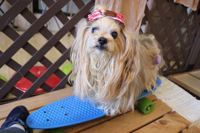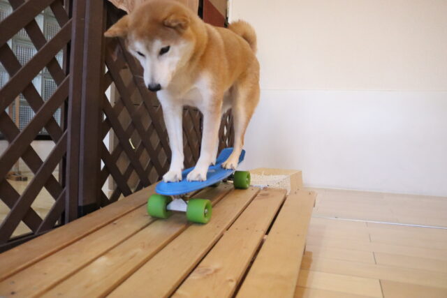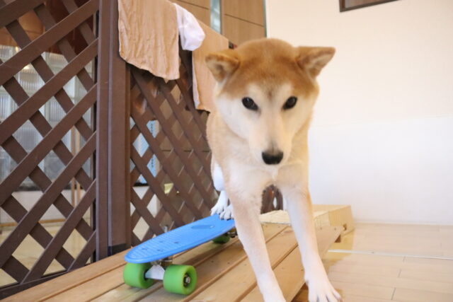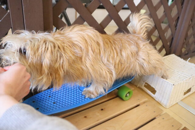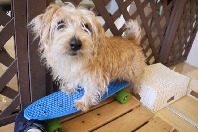 前足を乗せるとガラガラっと前へ進んでしまうスケボーに対し後ろ足がビヨーンと伸びてしまうオスカーくん💦