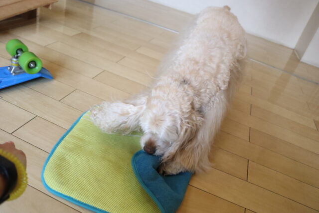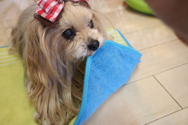タオルを咥えて…