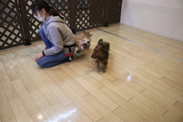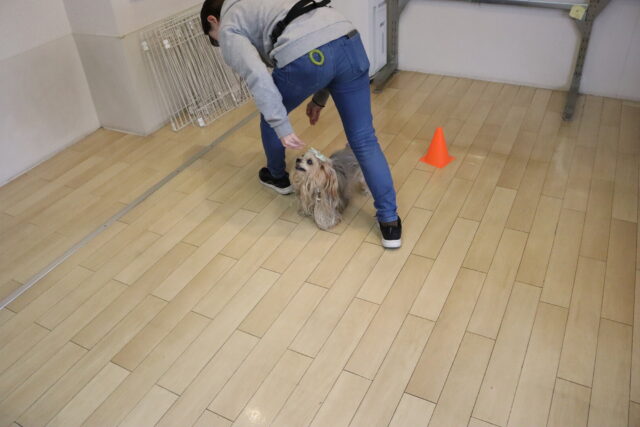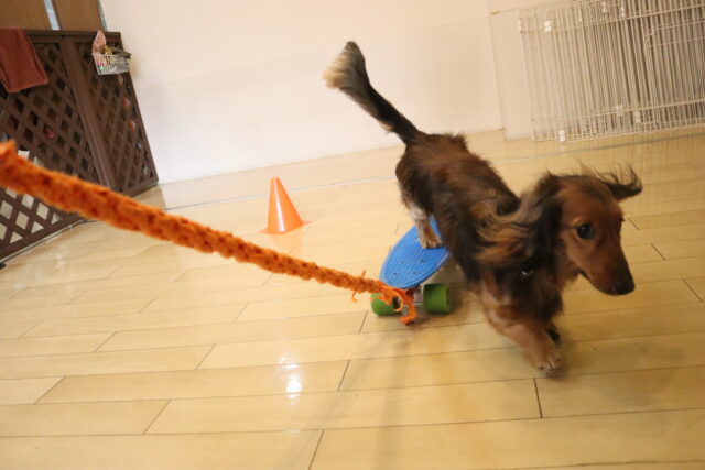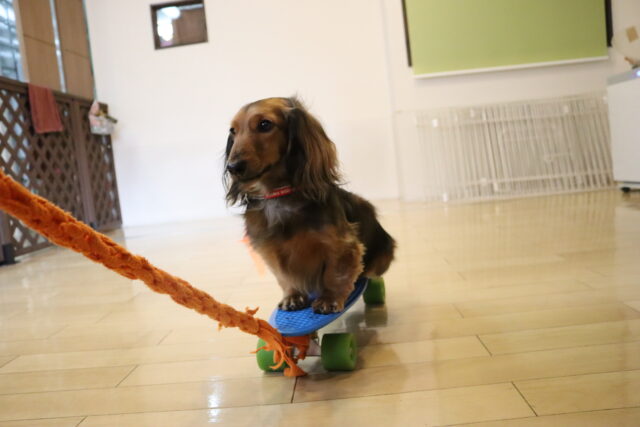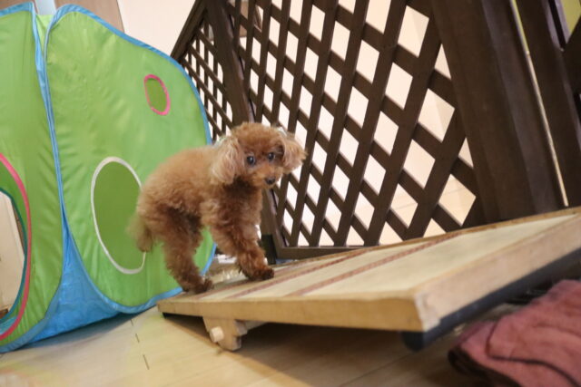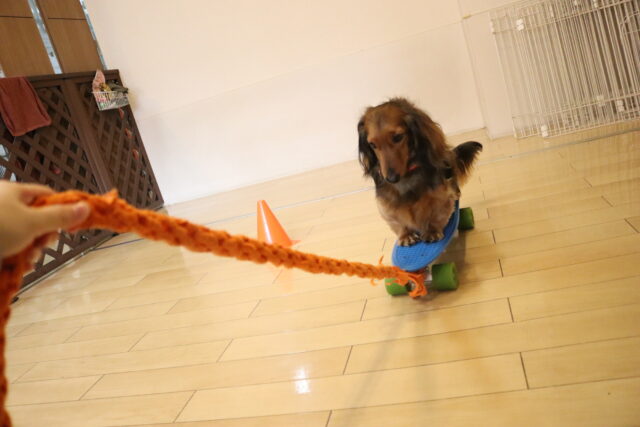 スタッフがスケボーを引っ張ると揺れる足場にビックリしたようで離脱💦