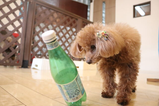 鼻先にリボンを着け前足で取ってもらおうとしましたが、全く気にしない様子…