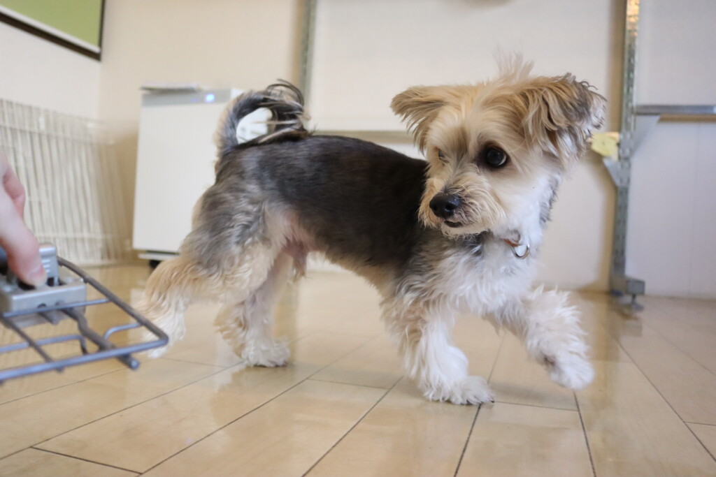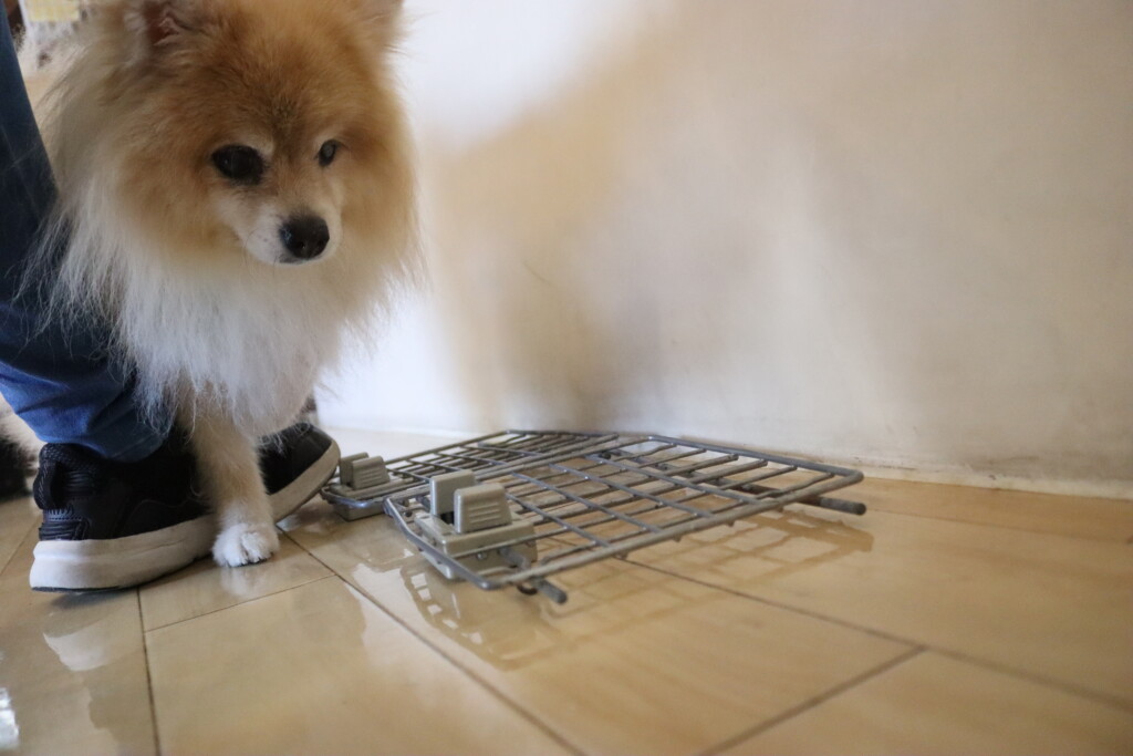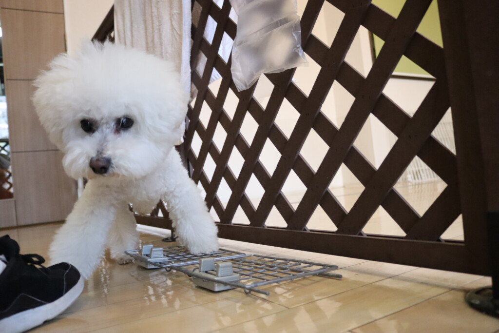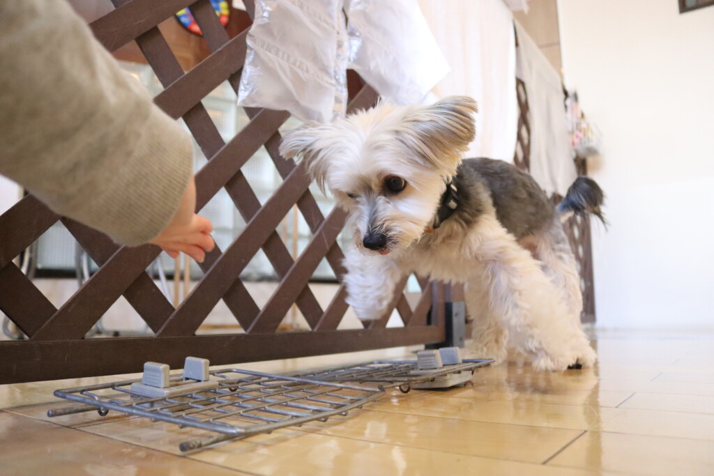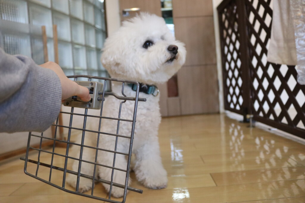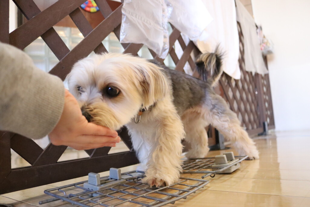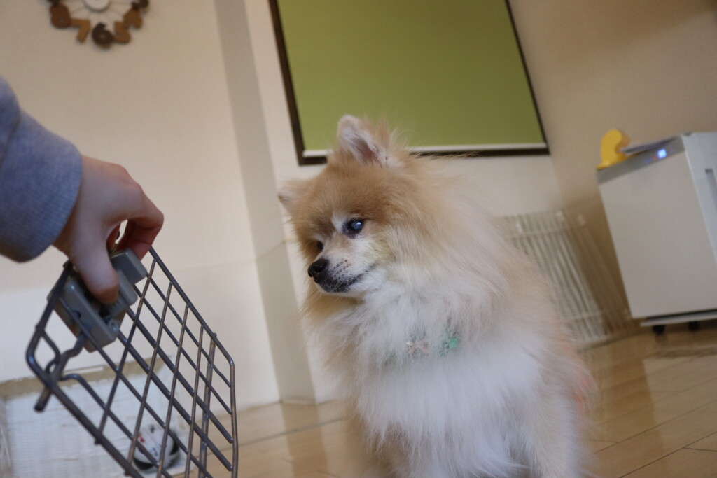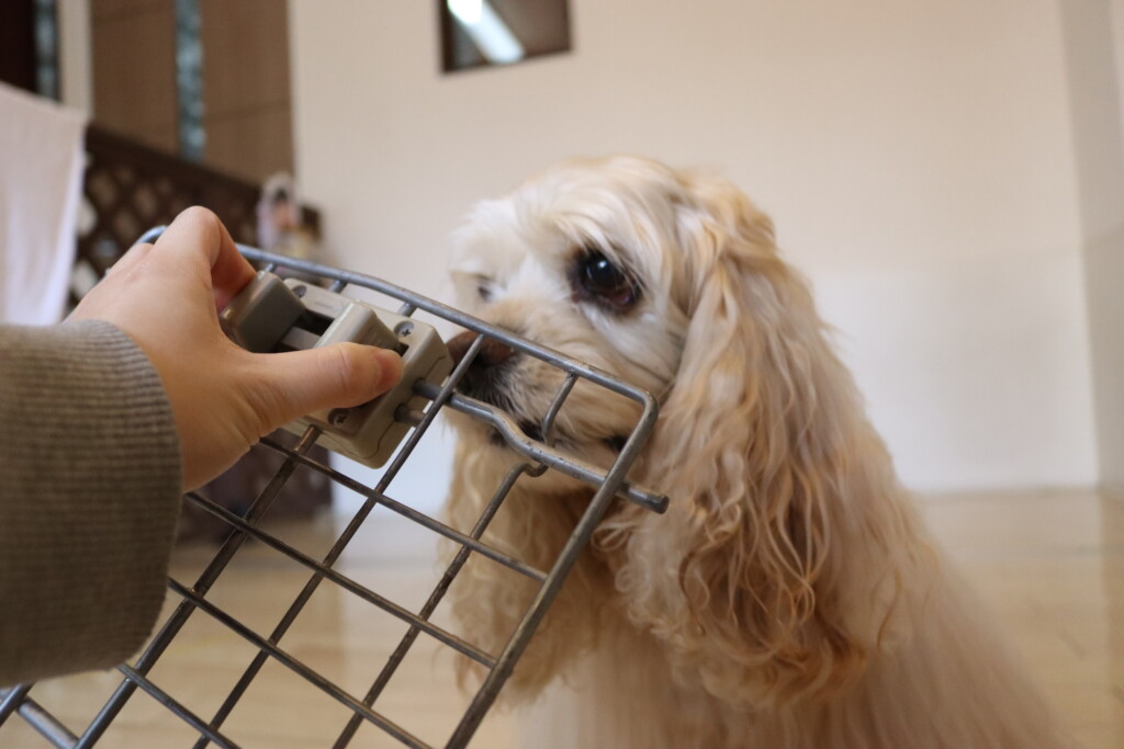 むぎくん、小春ちゃん、パピーくん、ノアくんはクレートの扉を使って物慣れ!