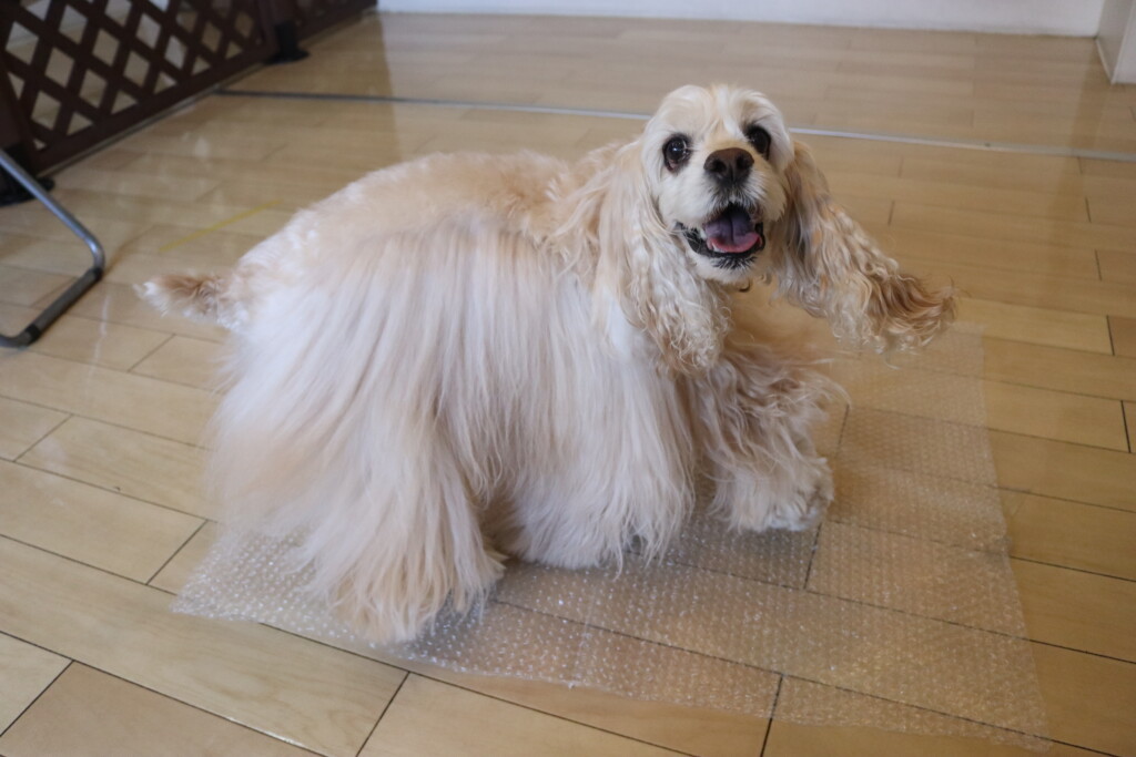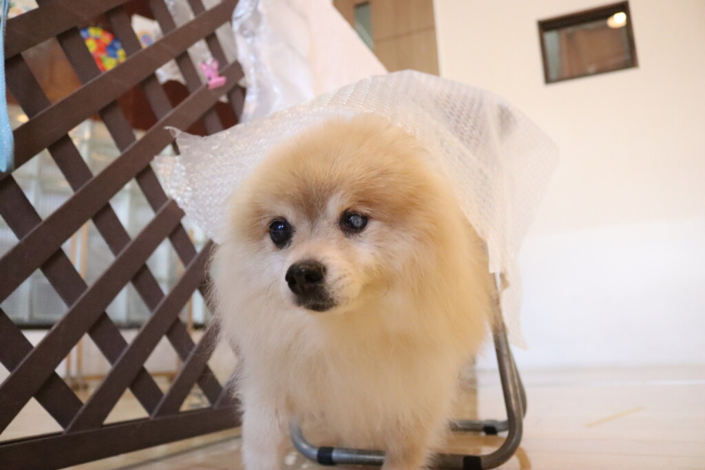 イスに掛かった緩衝材を始めは少し警戒をしつつも慣れてくるとルンルンで駆け抜けていましたよ☆