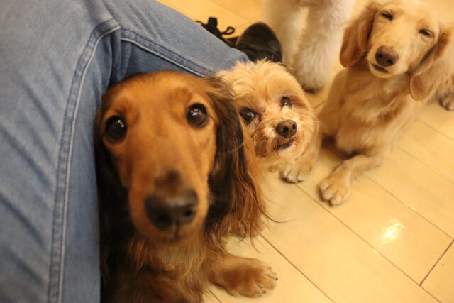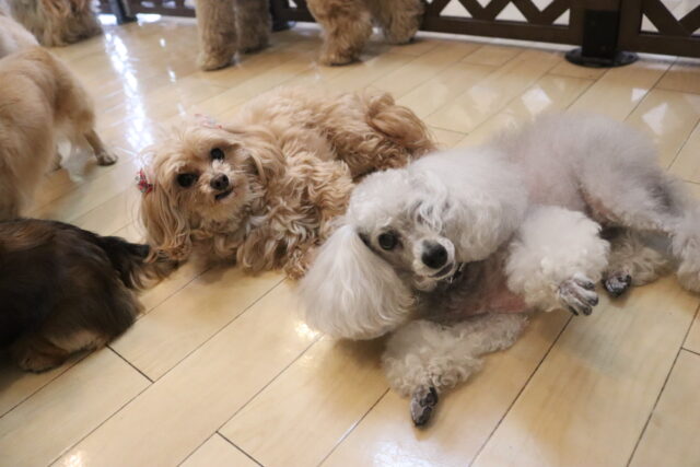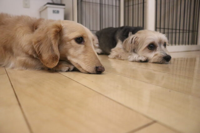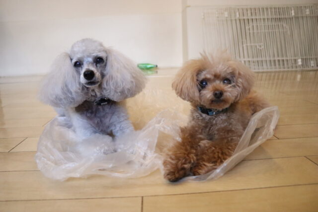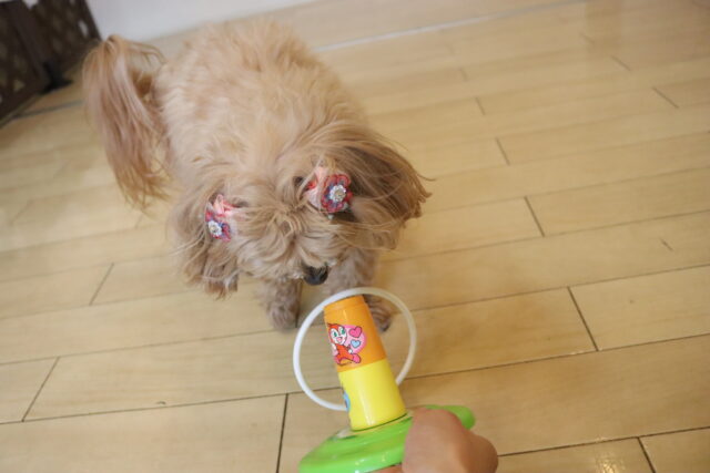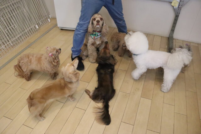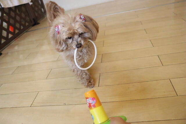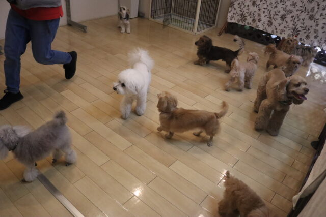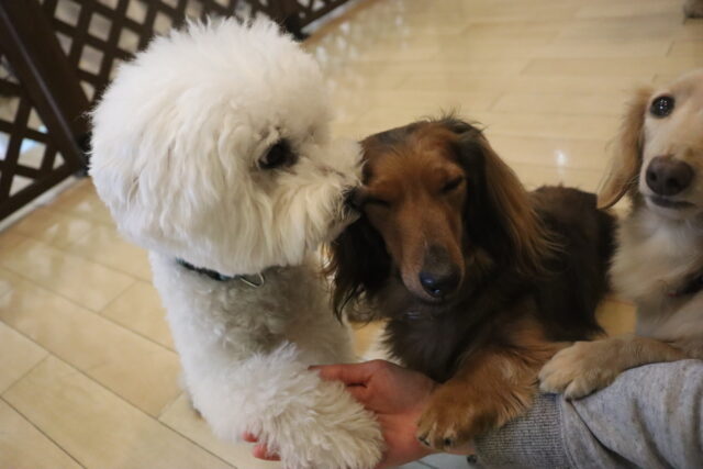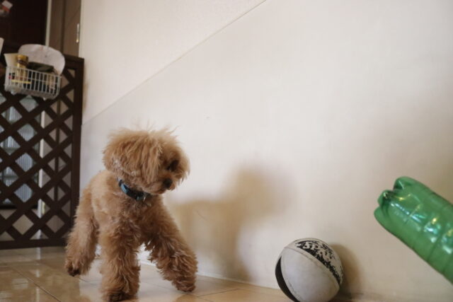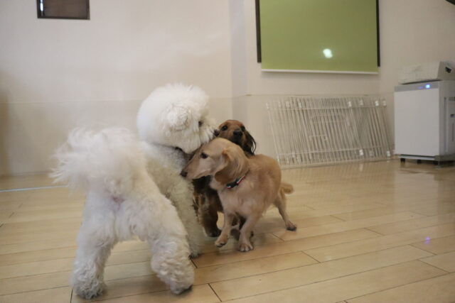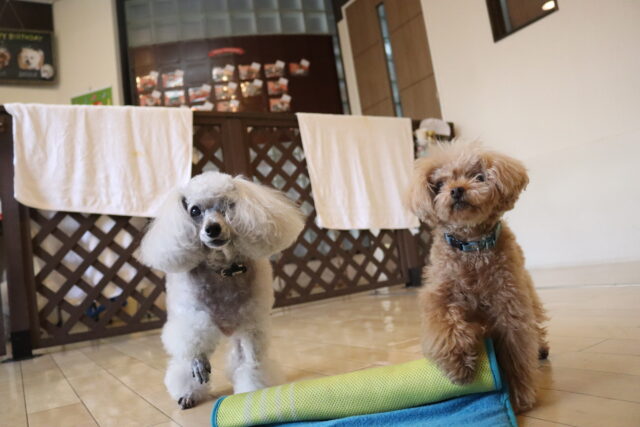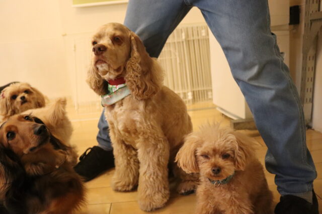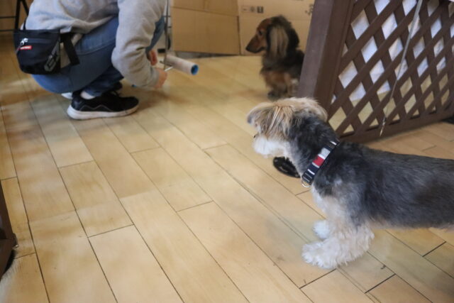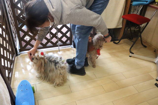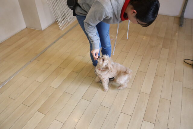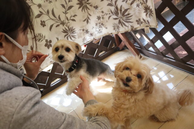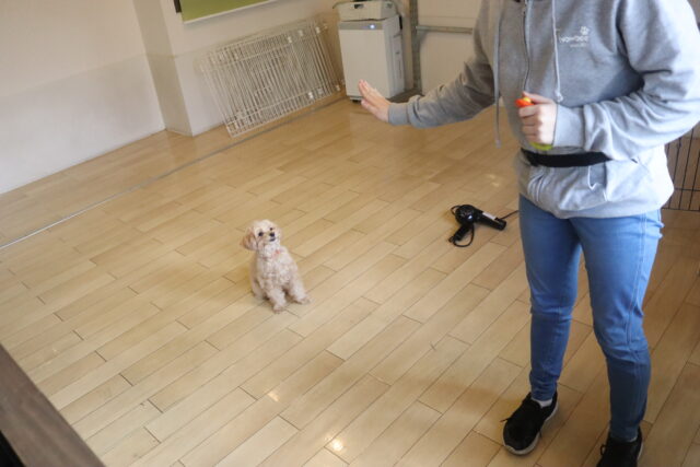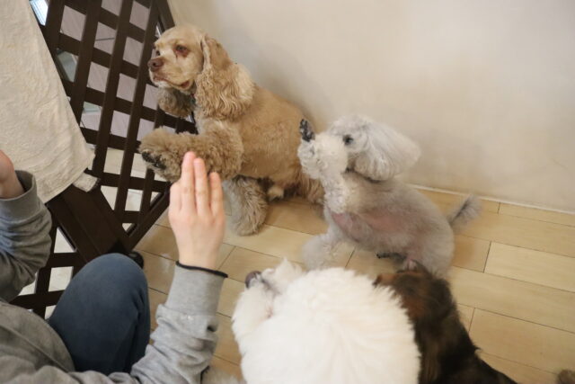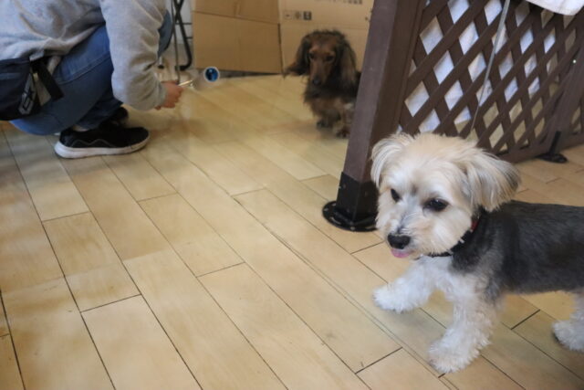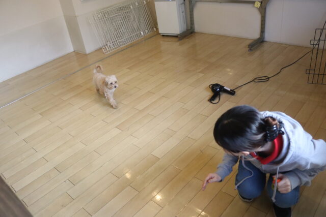 途中、隣りのトレーニングの様子が気になるようだったので試しに柵を開けてみたところ、らんくんと目が合い犬見知りのむぎくんはそのまま元の場所でトレーニングの続きを始めていましたよ(笑)