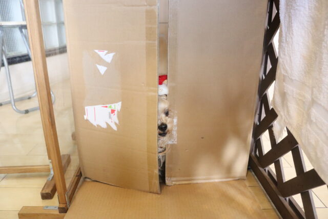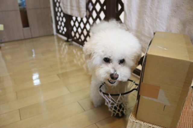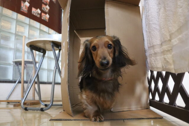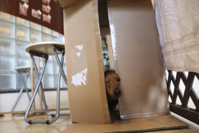 ダンボールのフタが開くことに気が付くとスルリとくぐり抜けてきてくれました♪