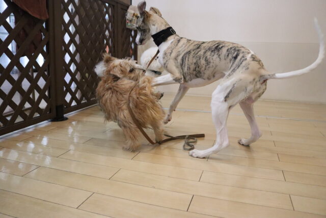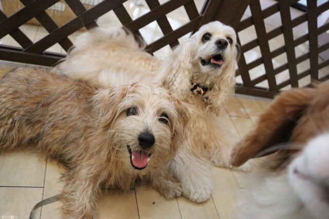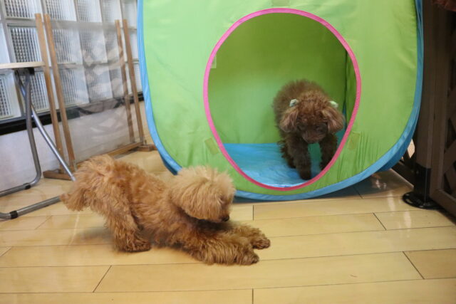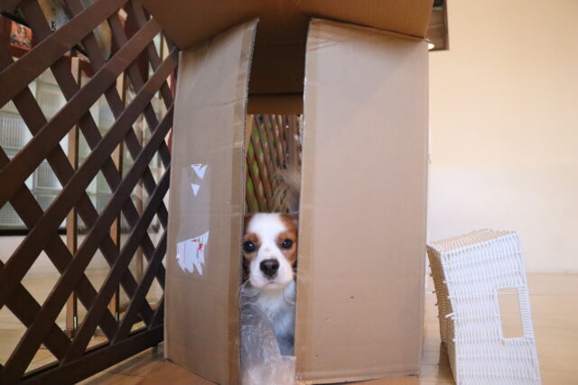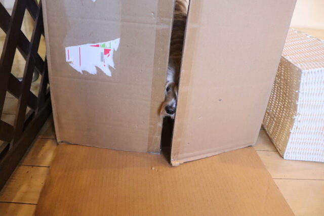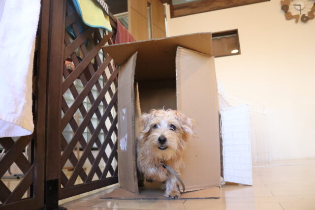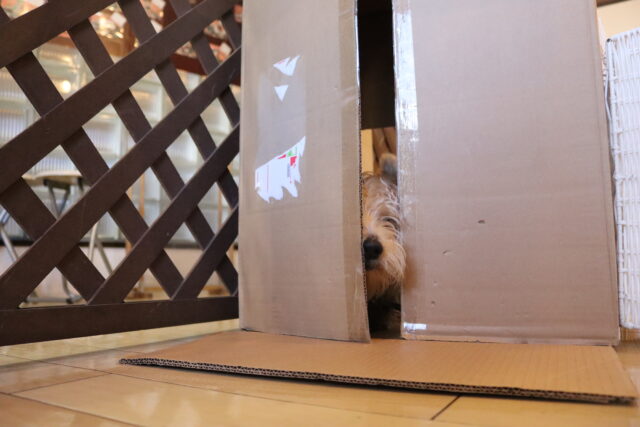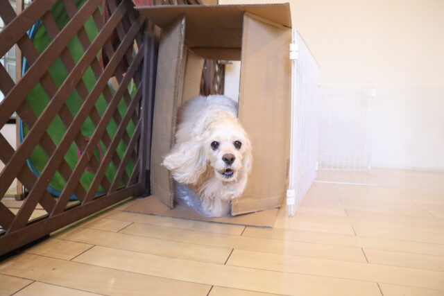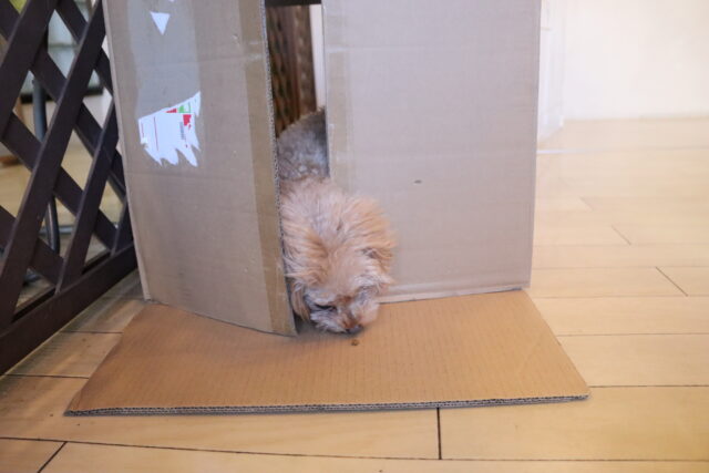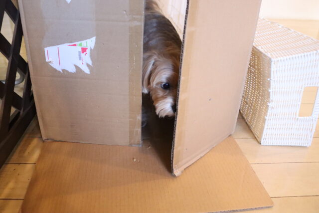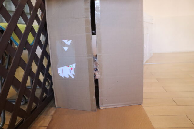 オスカーくん、茶々ちゃん、アルくん、ベルちゃんはフタの閉まったダンボールくぐりに挑戦!