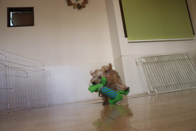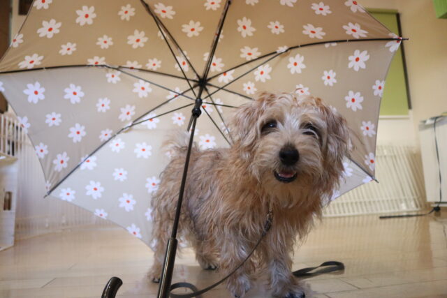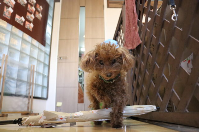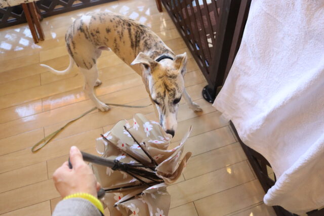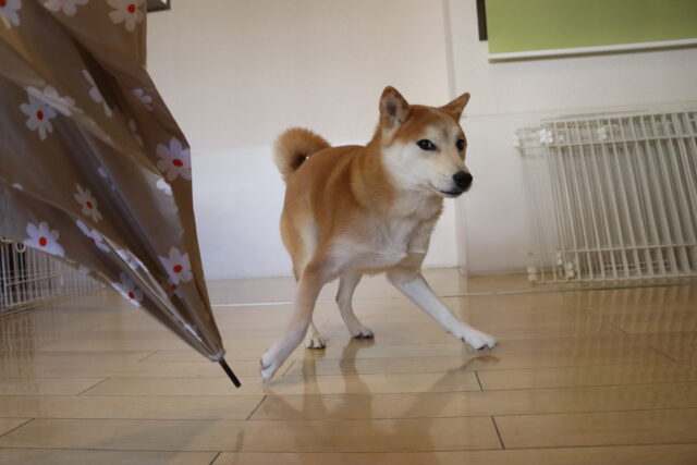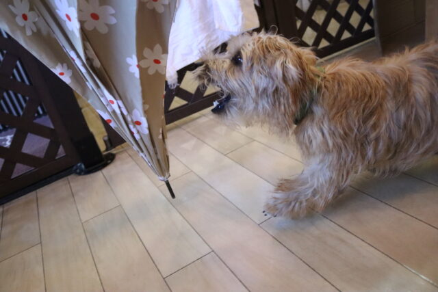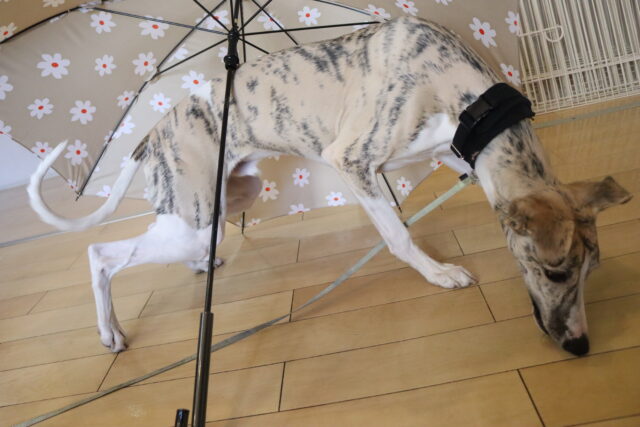 傘を持ってくるとオモチャと思ったのかガブリと食べようとするオスカーくん(笑)