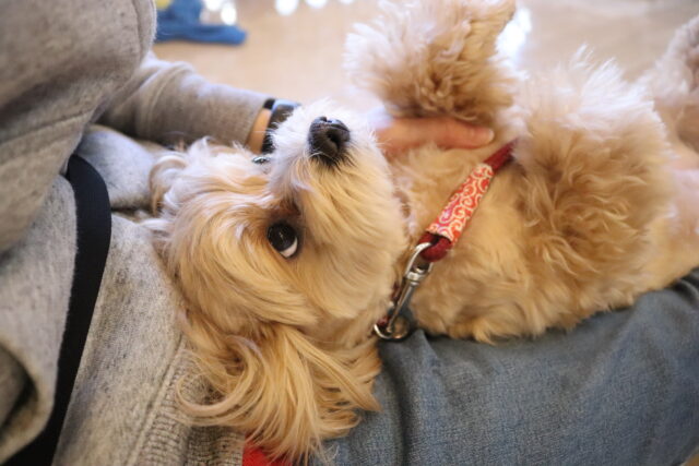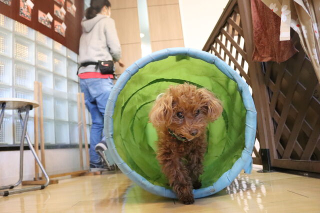 犬のぬいぐるみを乗せたカゴをスタッフの元まで届けようと一生懸命引いてくれています♪