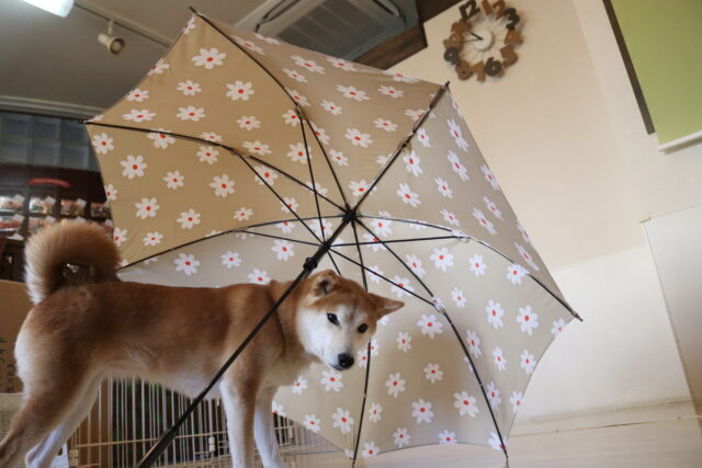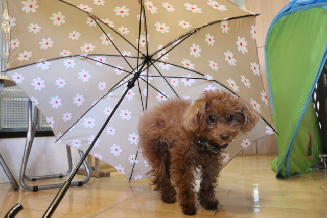 広げた傘の下は落ち着いてくぐり抜けてくれています♪