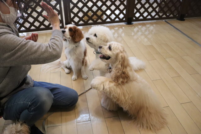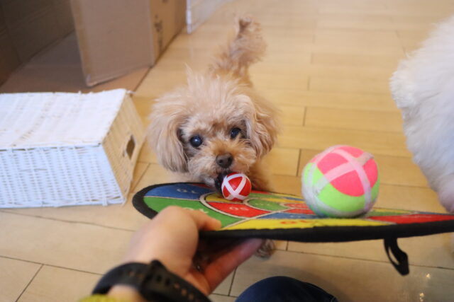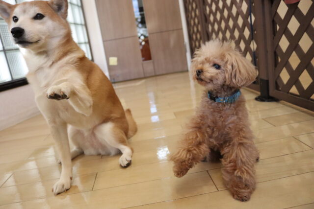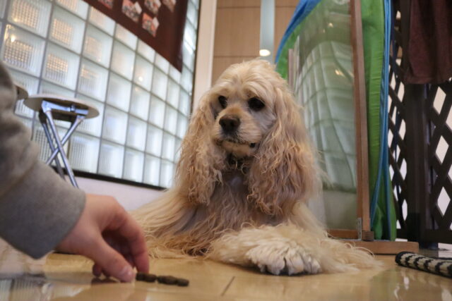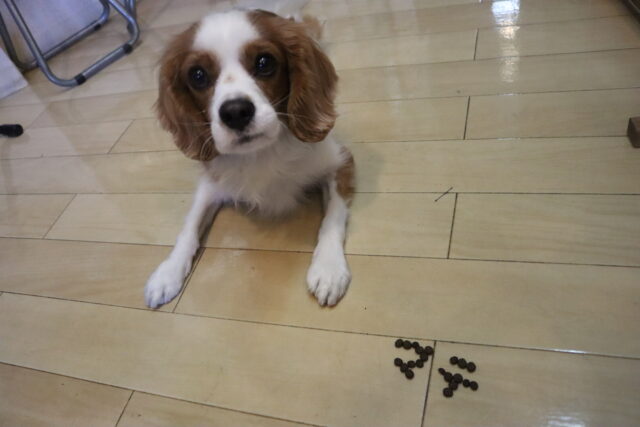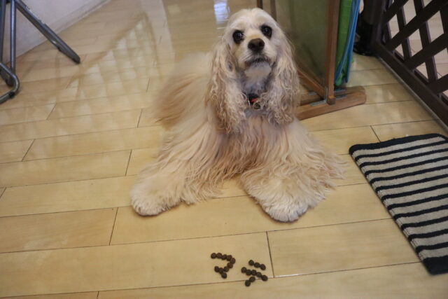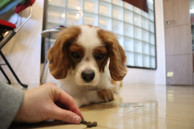 フードで「マテ」の文字を書いている間ジーっと見つめ、今にも食べそうなオーラを放っていましたがしっかりと我慢できたね👏