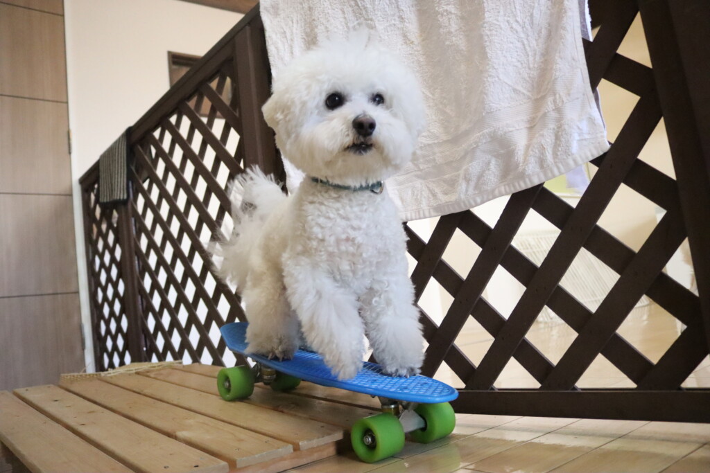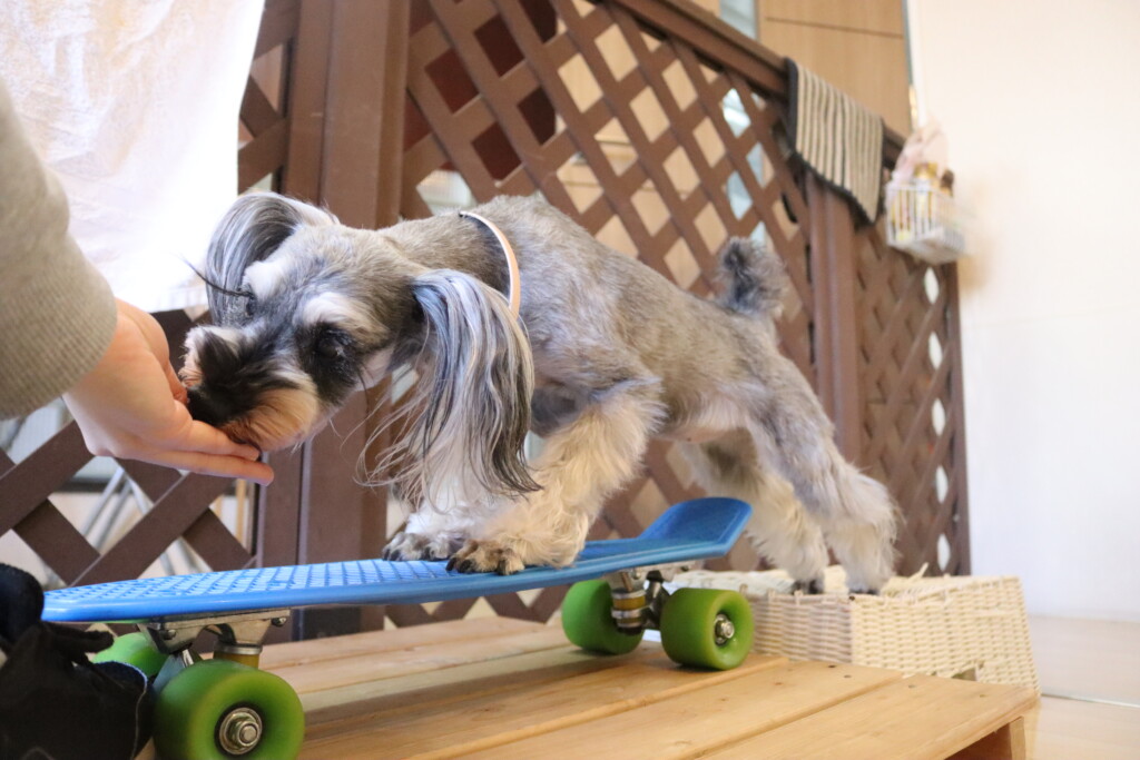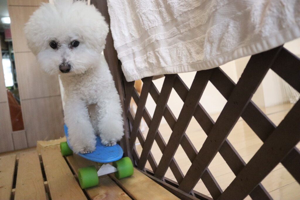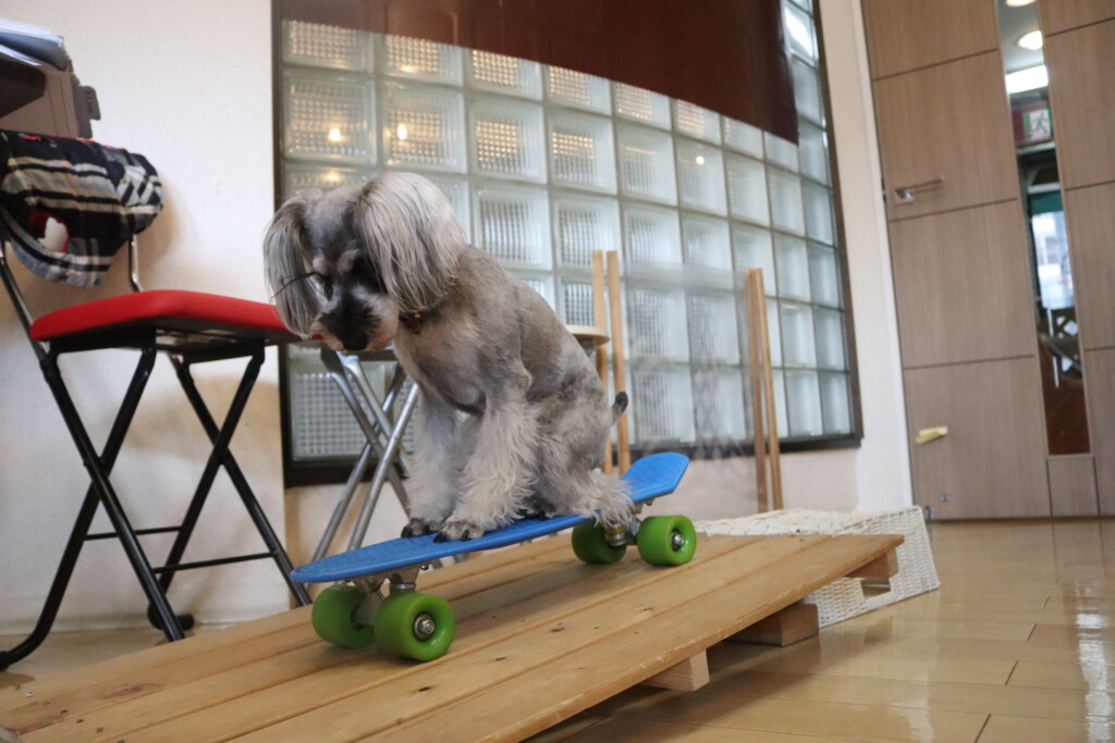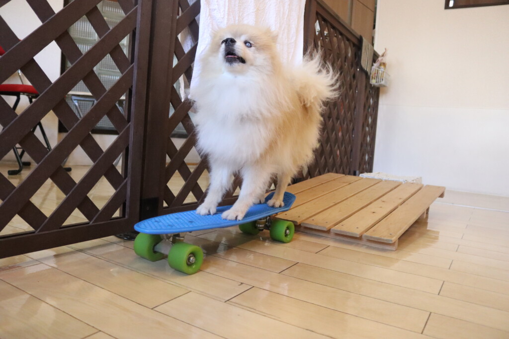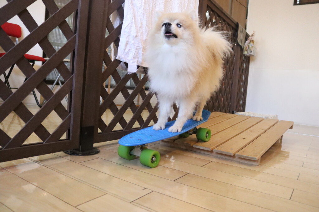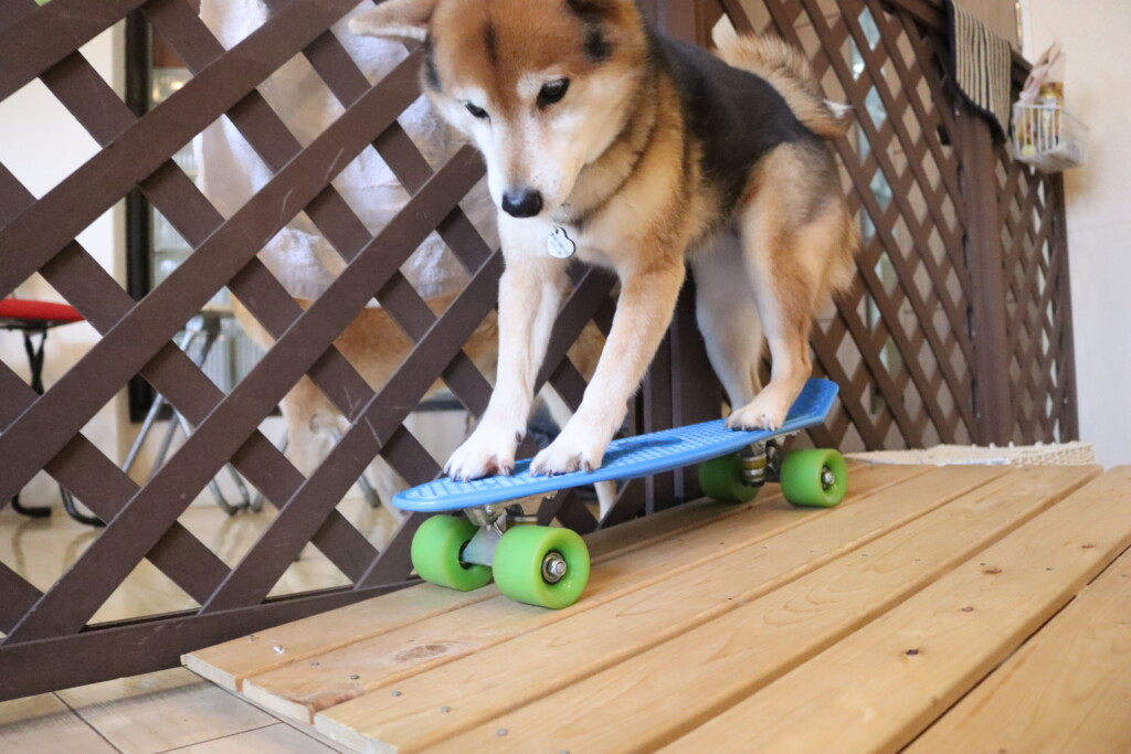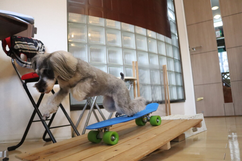 ノアくん、こむぎちゃん、あずきちゃん、甜ちゃん、パピーくんは坂道をスケボーに乗って下る練習!