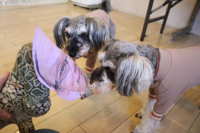 小春ちゃん、小春ちゃん、茶々ちゃん、ベルちゃんは今、仙川店で流行中のいないいないばあの練習を行いました!