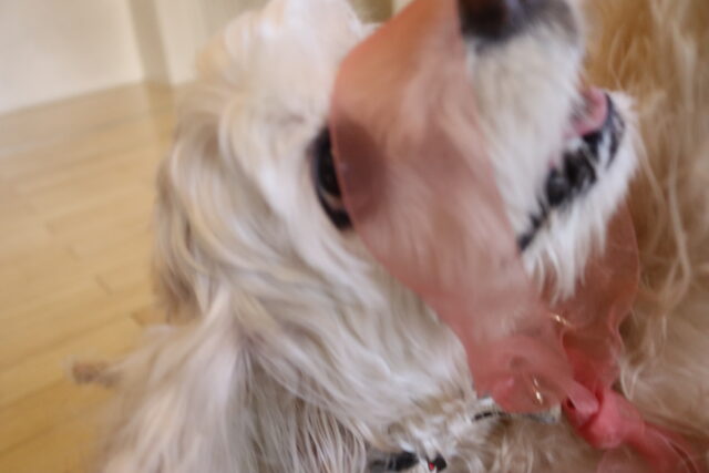 顔に掛けたリボンを取ってもらいたかったのですがニコニコ笑顔で待つベルちゃん…