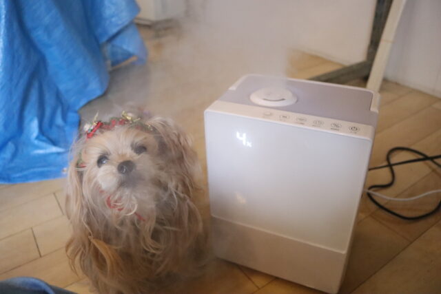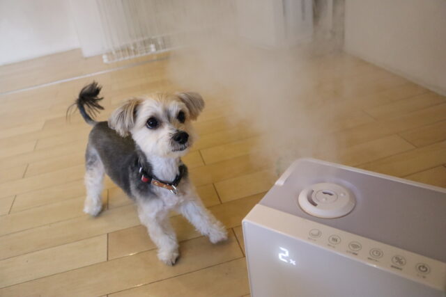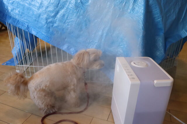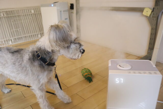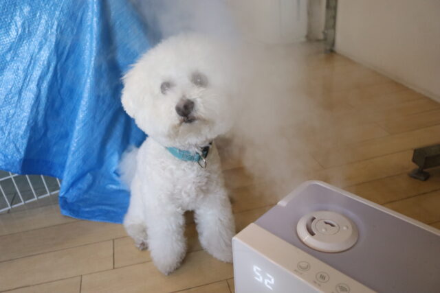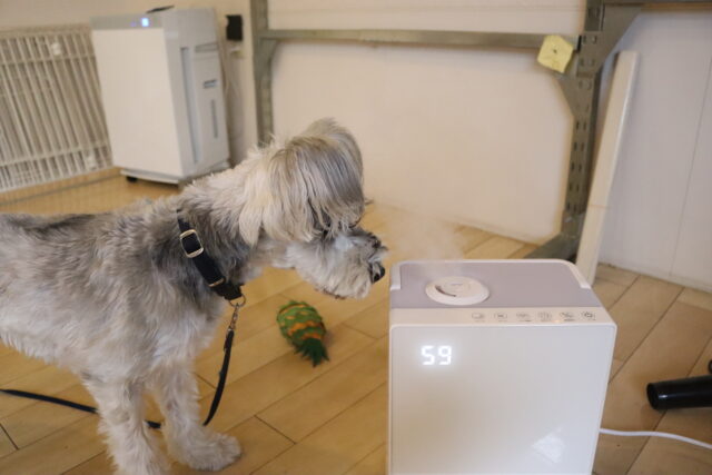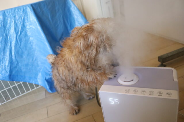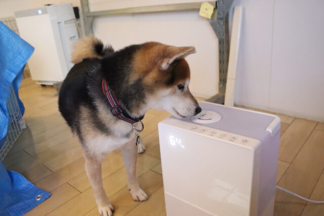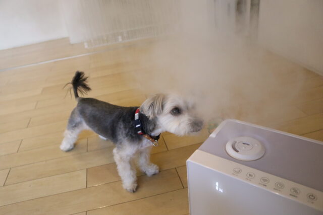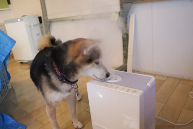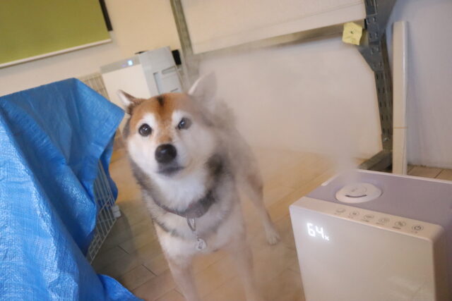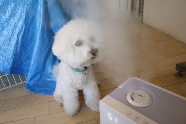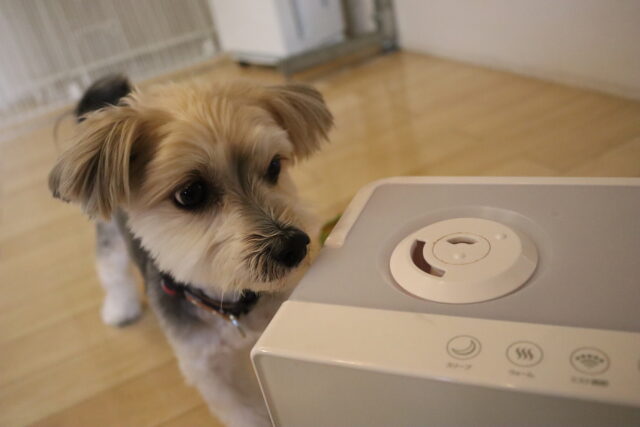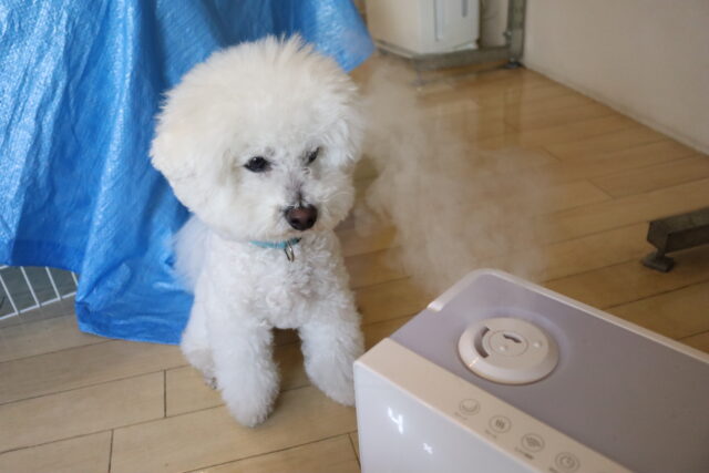むぎくんも「怪しいぞ…!」と加湿器をガン見👀