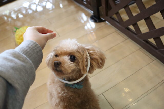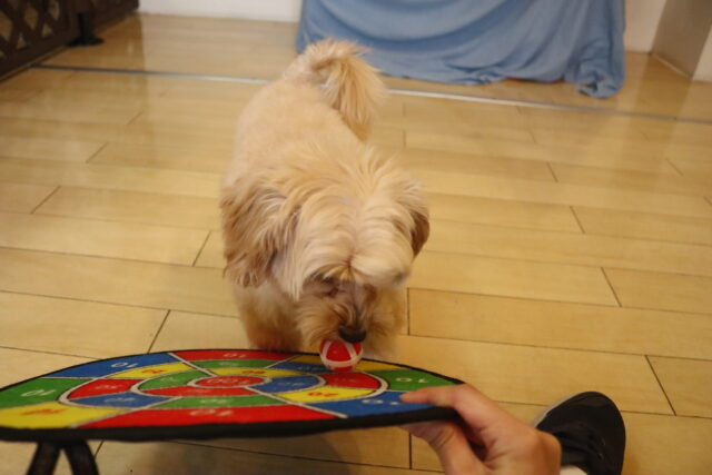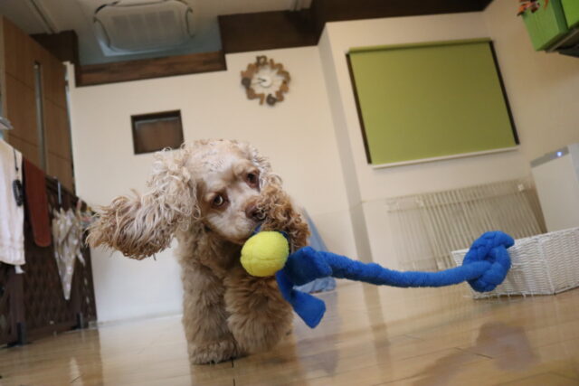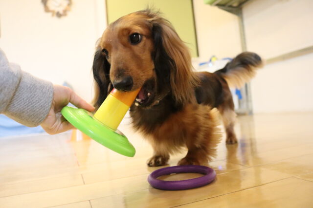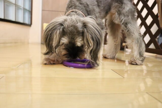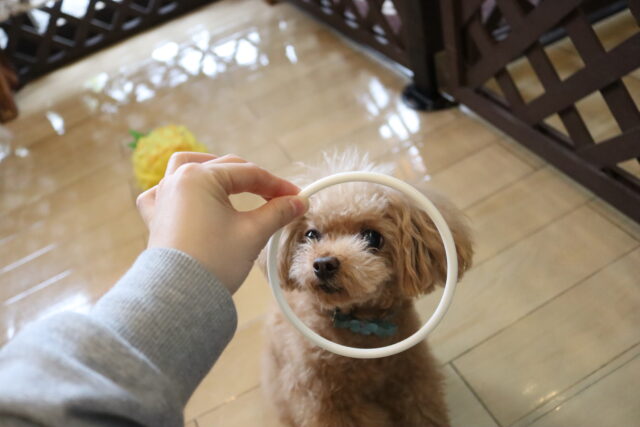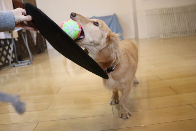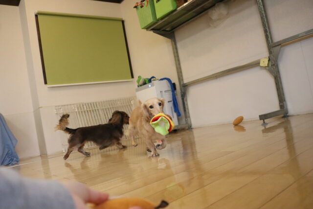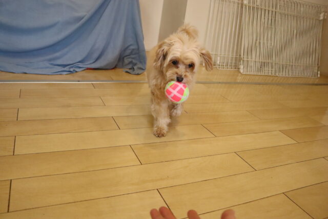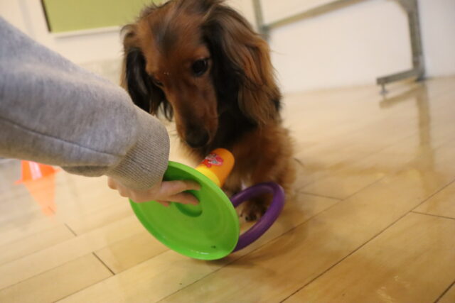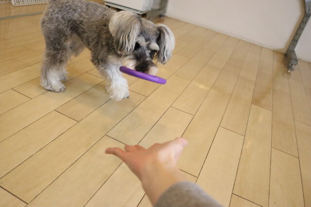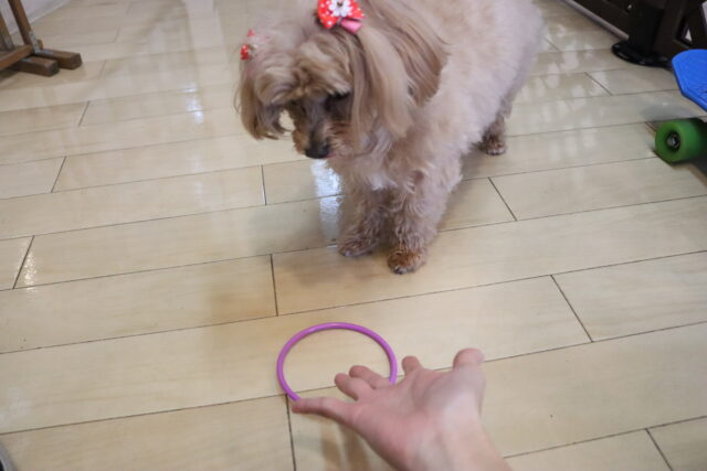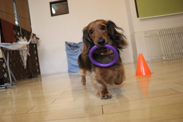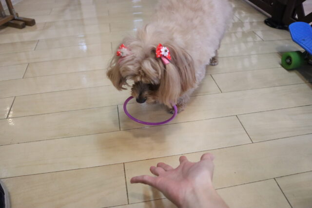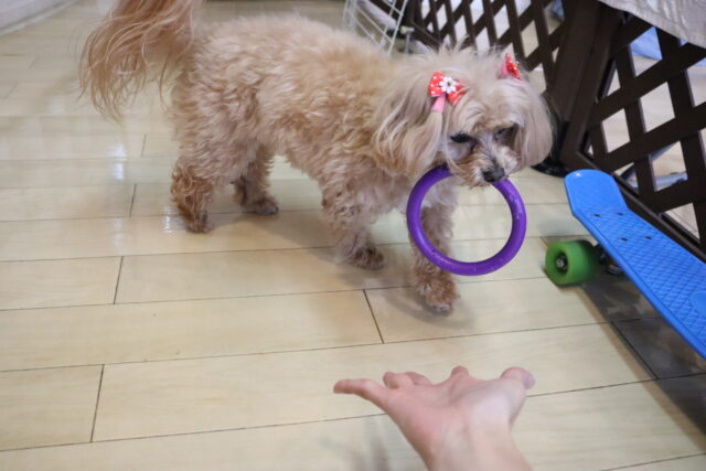 まずは柔らかい輪っかのおもちゃでレトリーブに挑戦!上手に持って来てくれるこむぎちゃん✨