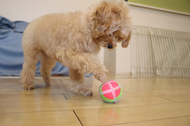 咥え方に戸惑い、前足でちょんちょんしたり、転がるボールを見つめたりしていましたが、