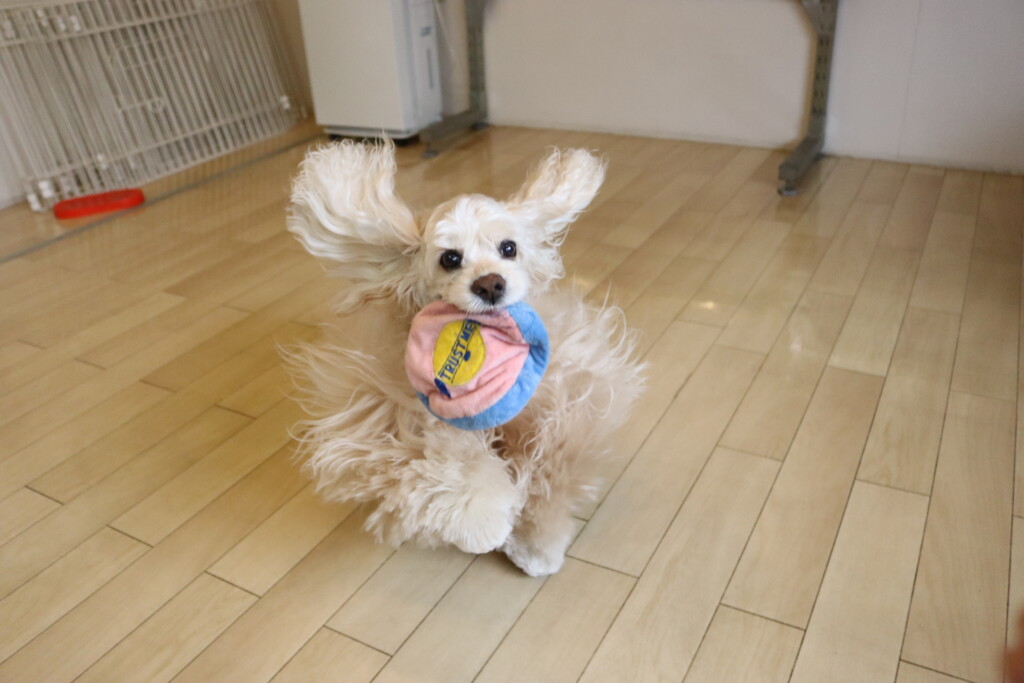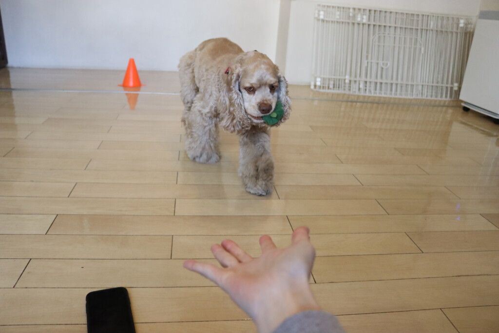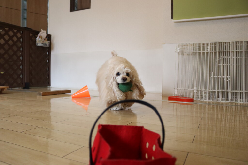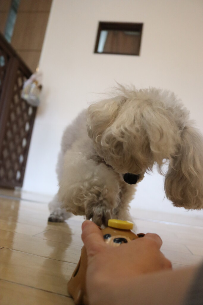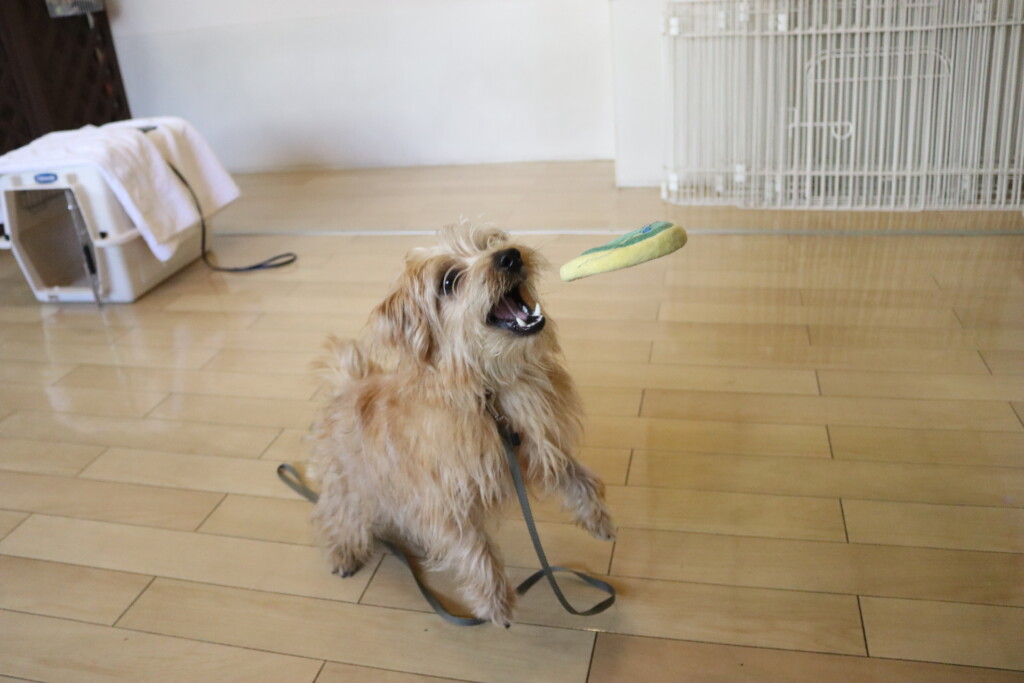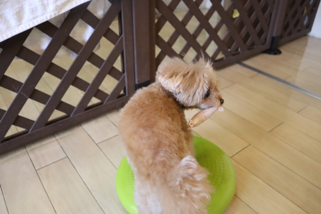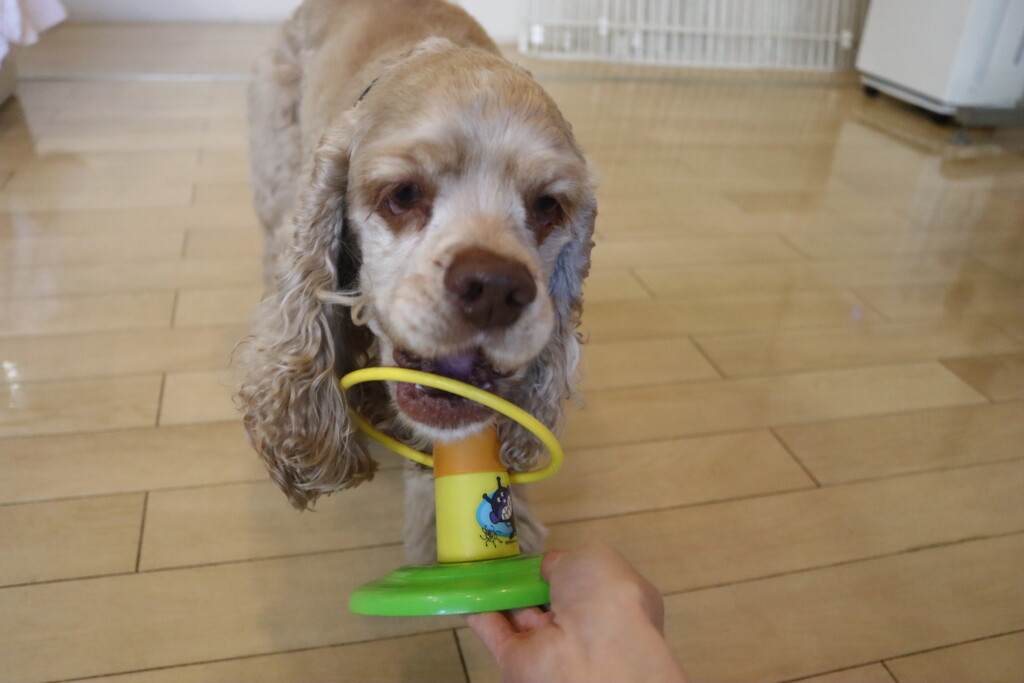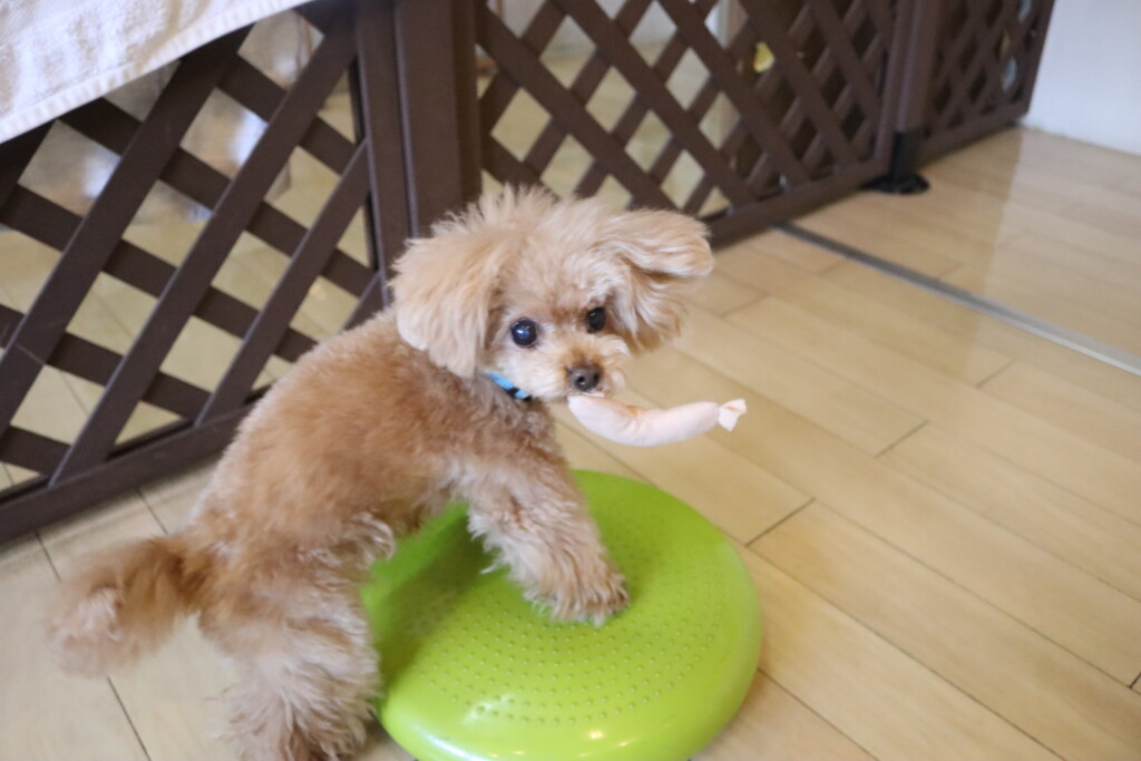 金ちゃんはオモチャを咥えてディスク回り!
