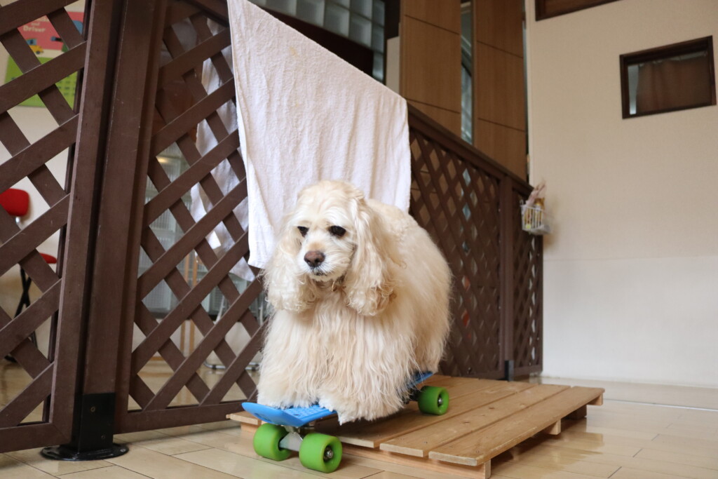 ベルちゃんは坂道をスケボーに乗って下る練習!